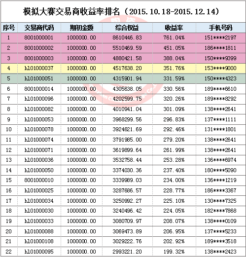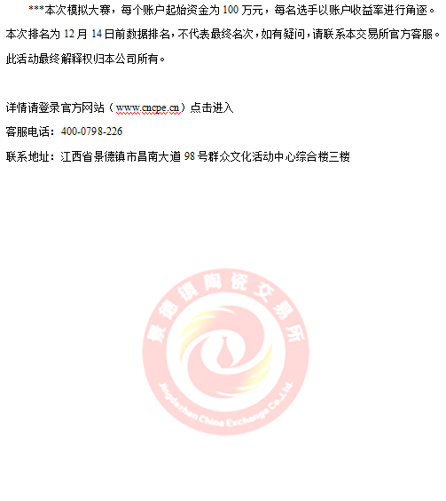 景德鎮(zhèn)陶瓷交易所首屆昌南杯模擬交易大賽10月18日火熱開賽以來,參賽人數(shù)持續(xù)攀升。通過近兩個(gè)月模擬交易大賽的鍛煉,參與模擬交易大賽的投資人會(huì)員對(duì)陶瓷藝術(shù)品投資的認(rèn)知度不斷提高,比賽也漸入佳境。截止12月14日收盤,模擬賬號(hào)"8001000001"以總收益率761.04%的成績(jī)拔得頭籌。"8001000002"以總收益451.05%的成績(jī)緊隨其后。"8001000003"以總收益388.04%成績(jī)位列第三。前二十選手的總收益也都在100%以上,值得慶賀。接下來的賽況如何,我們拭目以待!報(bào)名入口請(qǐng)點(diǎn)擊