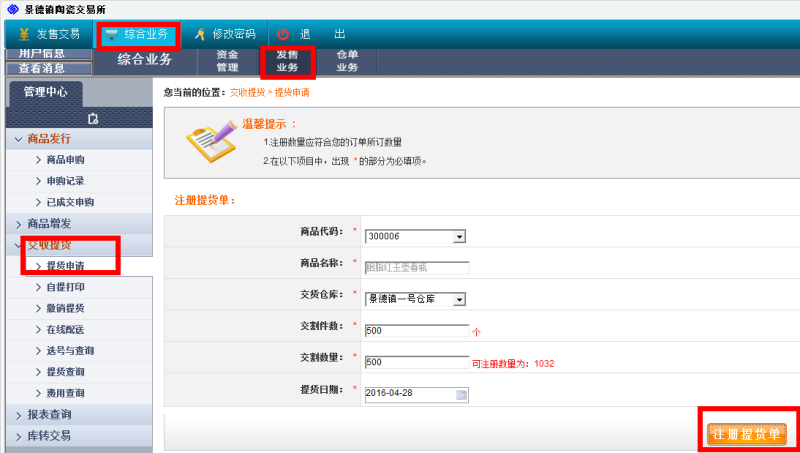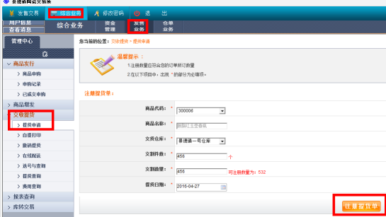 1.1、登錄客戶端,綜合業務---發售業務---交收提貨---提貨申請,注冊提貨單;