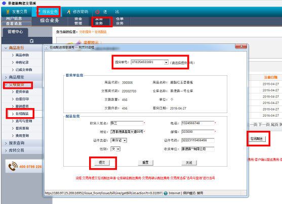 客戶端---綜合業務---發售業務---交收提貨---在線配送---在線配送---提交